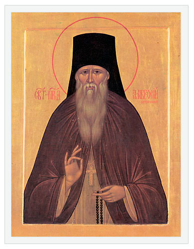 üks Optina kloostri suurtest staaretsitest (maailmas Aleksander Grenkov). Ta sündis 1812. aastal, Optina kloostrisse astus 1839. Staarets Amvrossist sai staarets Levi ja Makari järglane, ta pälvis mitmeid Jumala armuküllaseid ande – läbinägelikkust, tervendamisvõimet ja oskust lohutada vaevatuid. Tema juurde voolas kogu Venemaalt kokku tohutul hulgal rahvast, et saada vaimulikku nõu ja juhatust. Staarets Amvrossi mõjutas oluliselt ka selliseid tuntud kirjanikke ja filosoofe nagu F. Dostojevski, V. Solovjov, K. Leontjev. Vaga staarets suri 1891. aastal. 1988. aasta suvel kuulutati ta pühakuks, sama aasta sügisel avati aga tema pühad säilmed, mis praegu puhkavad taastatud Optina kloostri Templisseviimise peakirikus. Kirik tähistab Optina vaga Amvrossi mälestuspäeva 27. juunil (10. juulil) ja 10. (23.) oktoobril. |